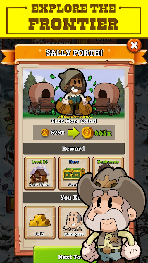 Idle Frontier: Tap Town – a city-building simulator with elements of economic strategy and clicker mechanics. Developers from Kongregate took the events to the Wild West during the gold rush. Adventurers and profit seekers are everywhere, dreaming of getting rich by fishing a portion of precious metals from the mines. But the competition is growing every day, and therefore the enterprising hero of the Idle Frontier and organize a nearby city that can make a profit on other people's whims and passions. The moment has come to build a new world and get rich. But it is desirable to act almost at lightning speed: the competition is only growing every day.