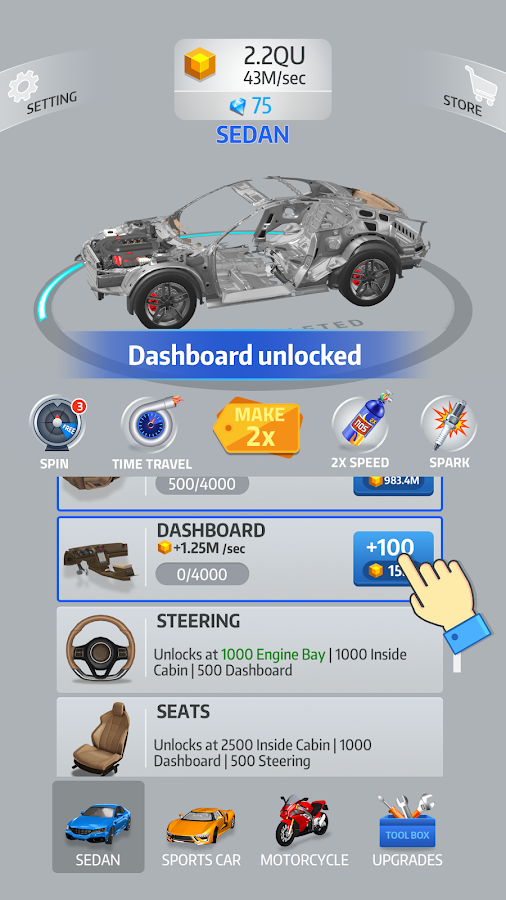 Have you ever wondered what makes a car drive? Experience every detail of creating a car from the ground up with Idle Car. Learn how a car works and what is needed to get there! Fun and easy to pick up. You will build your first car in no time!