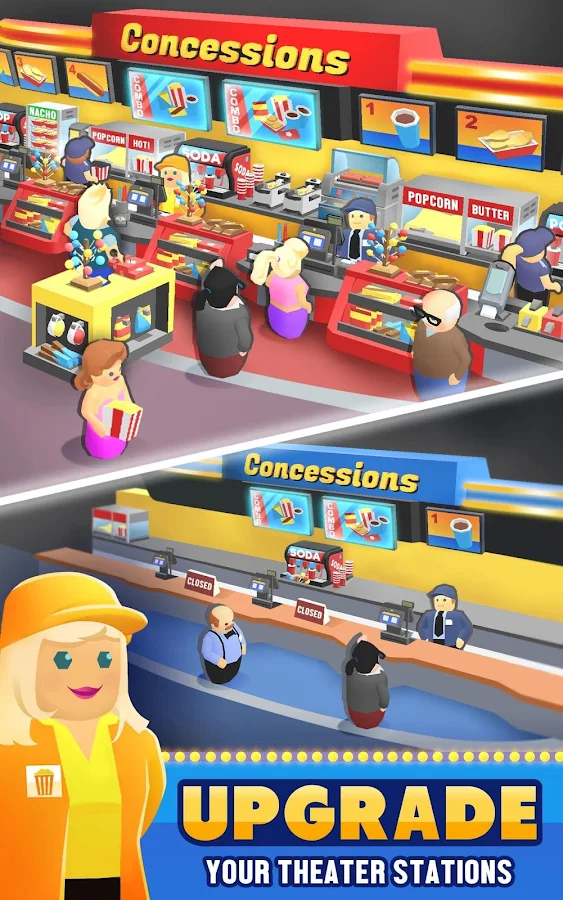 Box Office Tycoon – a casual simulation game with clicker mechanics and an entertaining atmosphere centered around the film industry. Developers from Hothead Games propose to develop a cinema located on the outskirts of a fictional city. And you have to start the path to the stars according to all the rules of the genre: first you need racks with popcorn and snacks, then halls with seats for visitors, and then shops with gifts. And every time you have to invest, discover new technologies, adopt the ideas of competitors. It is worth slowing down in development and here in the report there are losses, and the premises are empty. It's time to open up to new prospects and even take advantage of hacking for money - so your career will definitely go uphill!