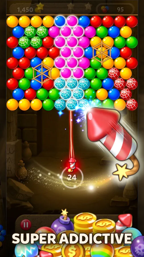 Challenge yourself to get the highest score possible on each level, earning stars and coins with each success! An accurate guiding line will help you to make tricky shots off the wall. Aim, match, and shoot carefully to pop bubbles and drop as many as possible! Get combos to charge up special boosters and super-charge your shots!