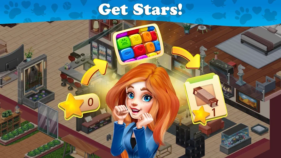Descoperă o nouă modalitate de a te bucura de meci - 3 jocuri, depășește nivelurile colorate pentru a obține vedete și folosește-le pentru a cumpăra mobilă nouă, a redecora penthouse-ul și multe altele! Progresează prin fiecare provocare pentru a debloca noi camere și a întâlni noi prieteni care ne vor ajuta în această aventură incredibilă.