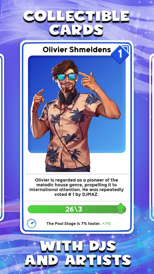 Собирайте редкие, эпические и легендарные карты, чтобы привлекать знаменитостей и новых менеджеров, развлекая посетителей и способствуя росту вашего музыкального фестиваля!